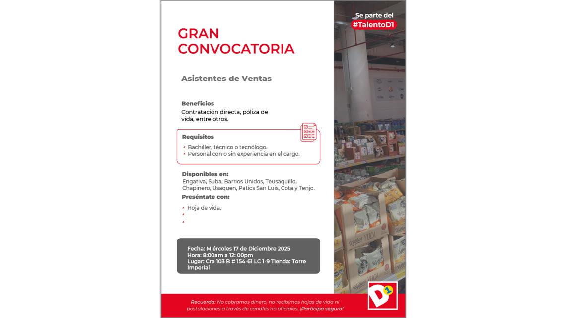 Si esta oferta es de tu interés, presentante el día MIERCOLES 17 DE DICIEMBRE 2025 EN TIENDA D1 TORRE IMPERIAL CRA 103B # 154 - 61 A LAS 8:00AM